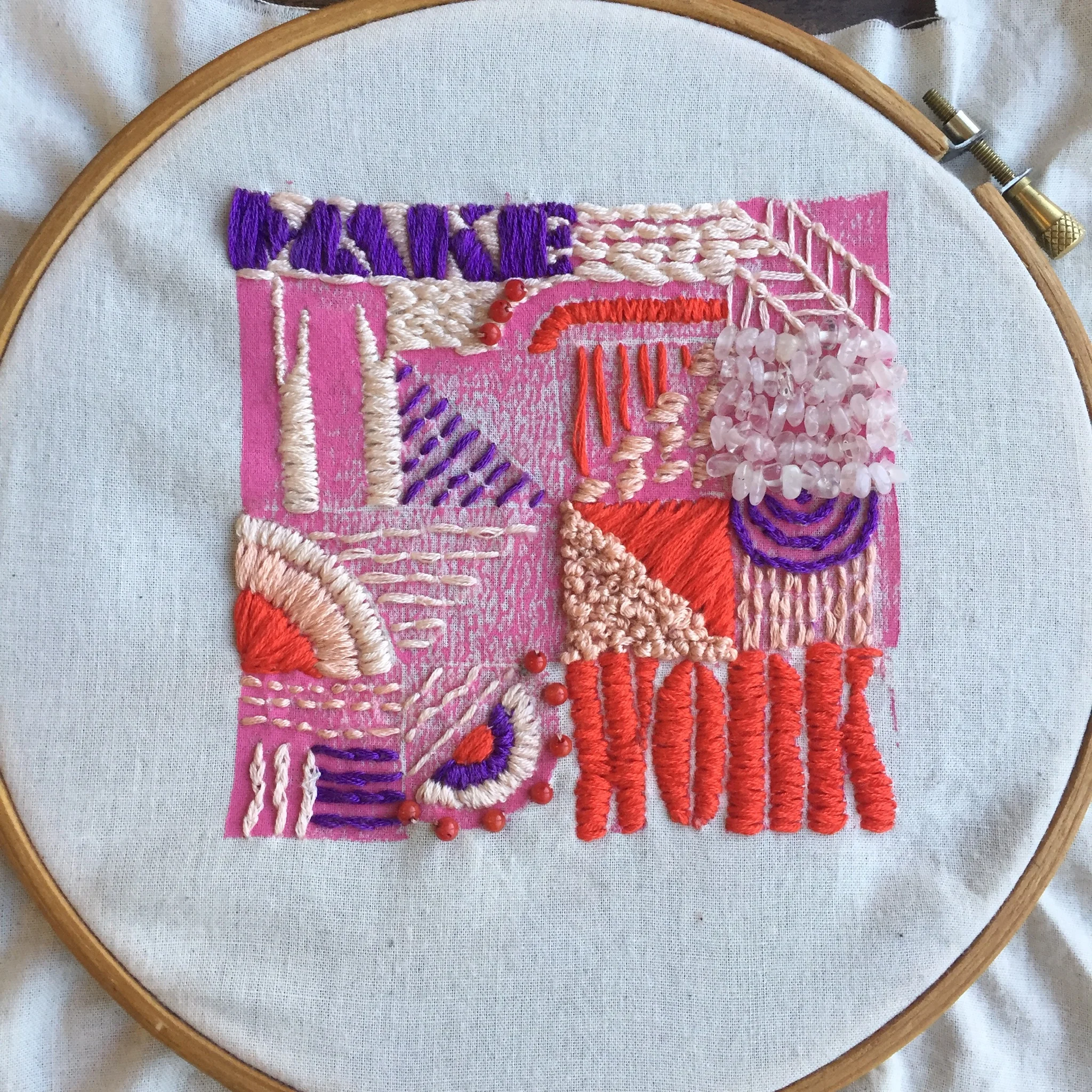 Then I decided it should be embroidered. Why? Well because I realized that embroidery was my weapon of choice/ wand of creation. I like painting in acrylic, oil, watercolor, watercolor pencil and gouache. I like drawing with all sorts of drawing utensils. But something about the motion of embroidery, seeing stitches on fabric and the optical mixing soothe my soul. In 2018, I learned that this is the best way to express myself.