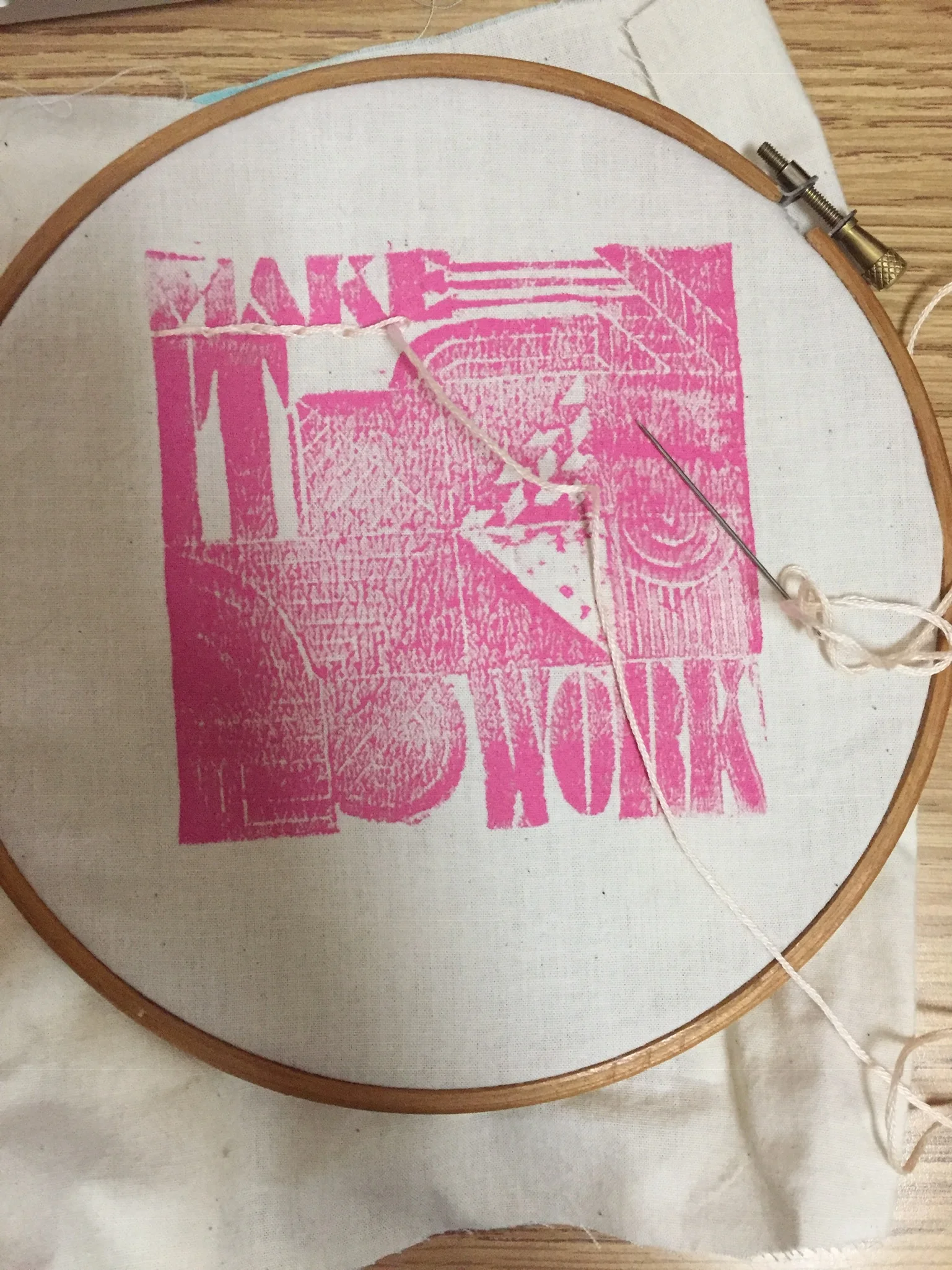 While my needle passed over the colored lines, I thought it would be cool if some of the areas were covered by ink or paint instead the whole piece being stitches. That’s when it hit me…block print! I had been playing with block printing my repeats designs. I also did a ton of a research recently into the process. I could create a block that would make a consistent print and embroider over that. I could make many of them but they would still be unique.