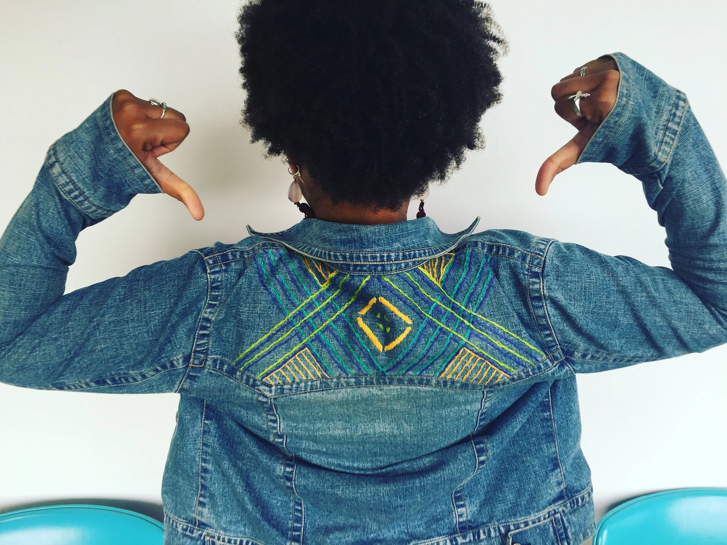 The denim jacket that I hand embroidered with a geometric design is one of my favorite pieces of 2017. And the earrings are my creation too.