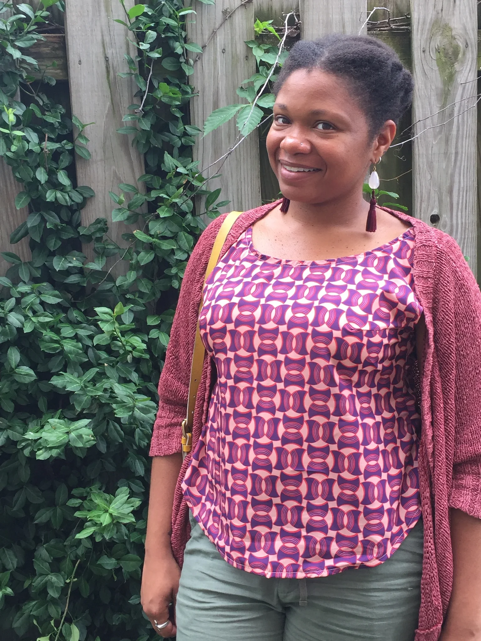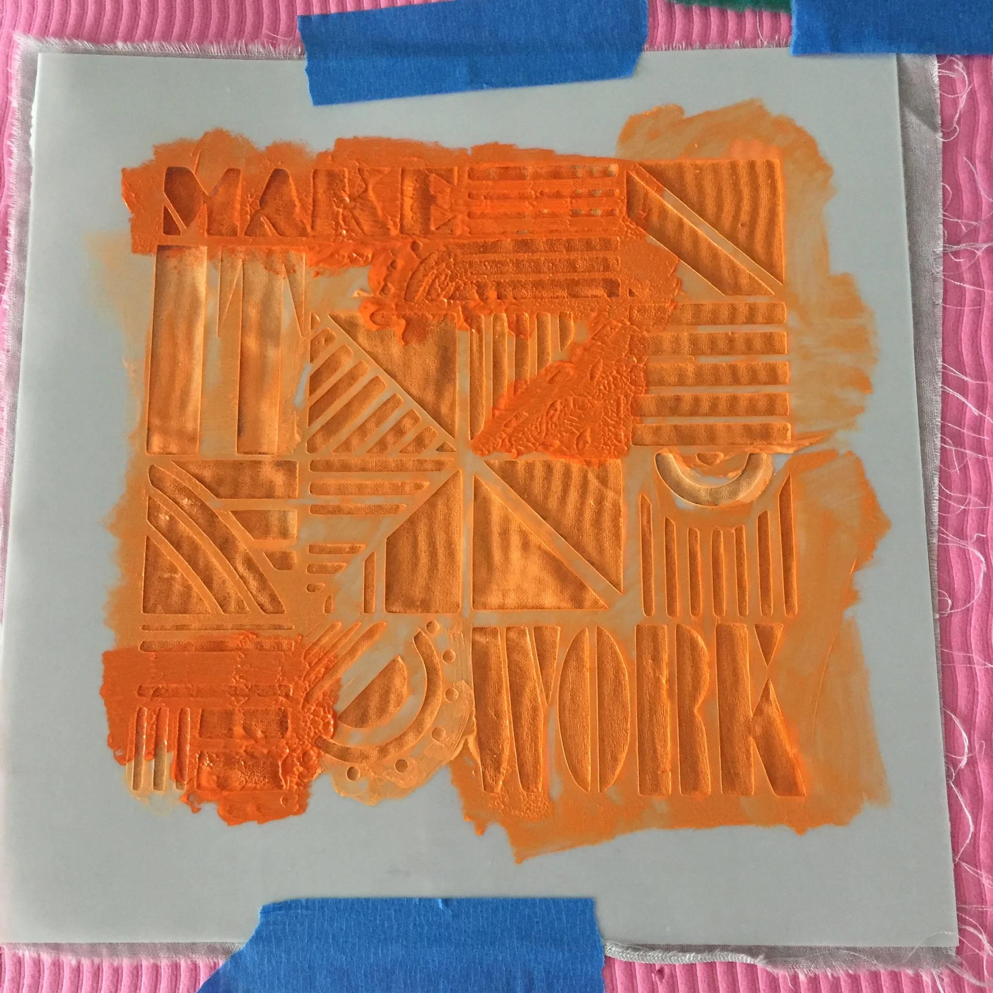 The continuous print of my “Seek Yourself” design looks great. I was already worried of messing up the repeat with block printing. The clear stencil made it so much easier. The “Seek Yourself” design is also available in a different version on Spoonflower if you are interested in buying it. I feel comfortable creating hand printing yardage this way. The sublimation print version on Spoonflower (seen in the adjacent photo) has a very clean, smooth quality. The hand printed version is gritty and organic. I love both versions! Something for everyone.