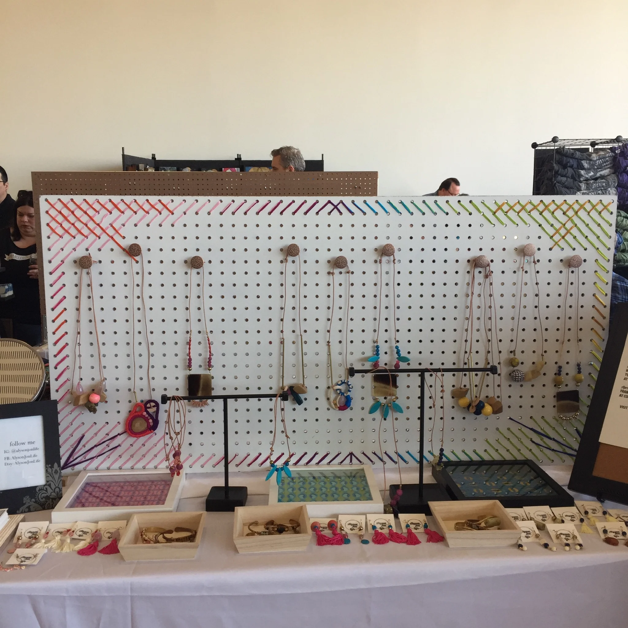 By 2018, we had already had a car for several months. This meant that my booth display could evolve. I was obsessed with looking for booth display ideas. How can I create a standing custom display with owning power tools? There are lot of ideas of there but it was mostly shabby chic inspired. More modern displays seem to use basic carpenters skills and tools that I do not possess. Then I saw a feature about customizing pegboards for craft rooms. One pegboard was embroidered. I decided to embroider a pegboard as a display for my necklaces. The show in which I unveiled this masterpiece was Craftin Outlaws Spring Fling at the Columbus Museum of Art (a perfect venue!). I also utilized a craft booth tip about putting my table on risers to make my jewelry easier to see. This was my best show to date.