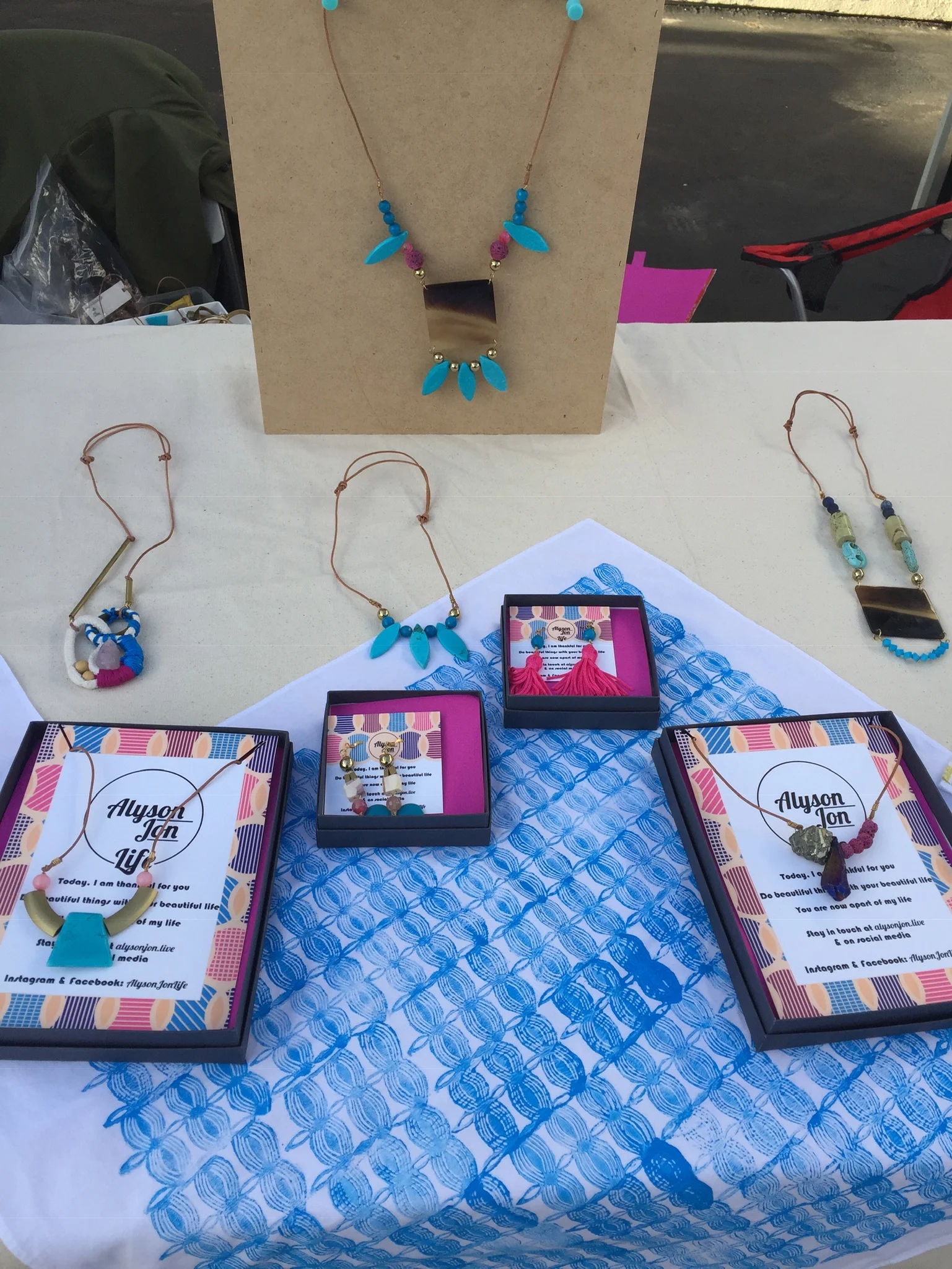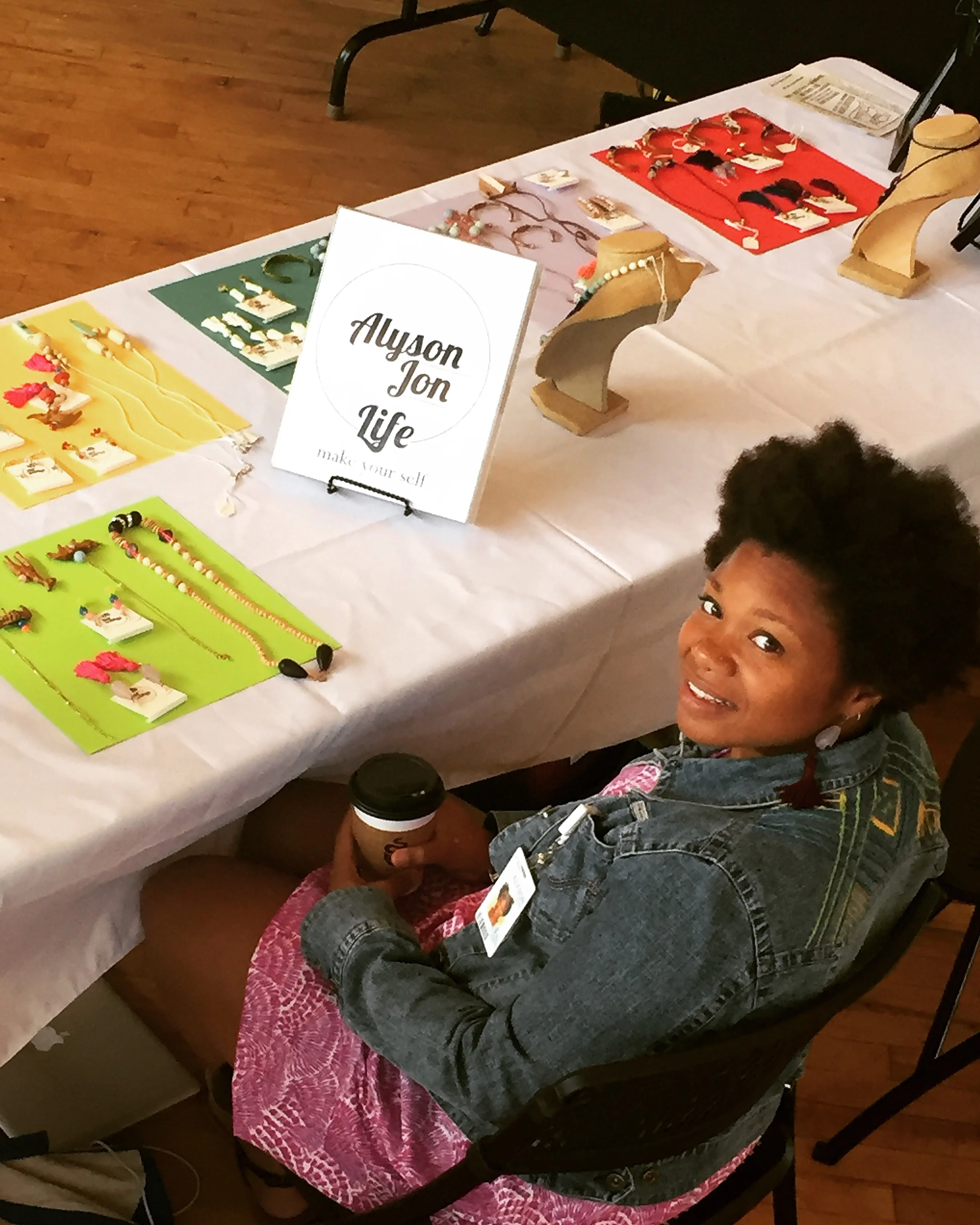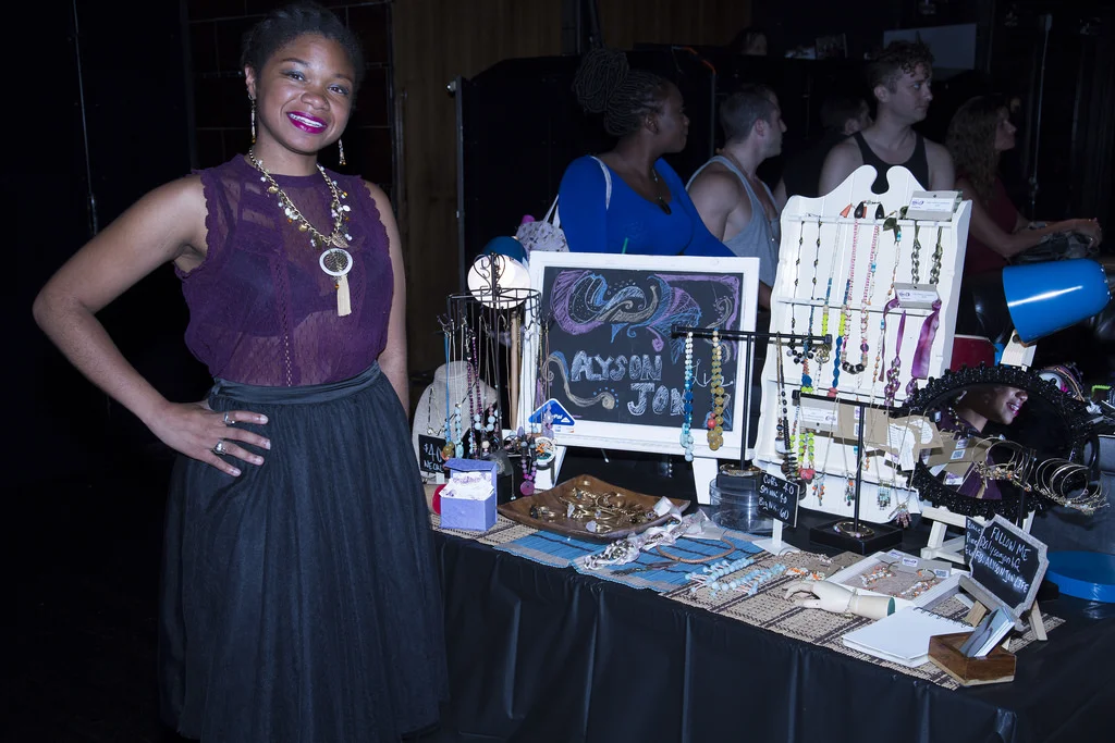 In 2015, I was in a Raw Artist Showcase at Highline Ballroom in Manhattan. This was my first booth in several years. The Highline Ballroom is a nightclub venue so it was not a great set up for a craft fair. Most vendors used the circular dining booths to display their products. Fortunately, I was assigned the table at the end of the booth. I had a lot of traffic and more lighting than other vendors. The lighting situation was a nightmare. They warned us and brought a couple of colorful lamps to spotlight my jewelry. At the time, I did not have a full understanding of my brand. I had painted some thrift store finds for custom displays. I used a chalkboard and jewelry displays that I found at HomeGoods. I realized here that my necklaces were too long for most of the displays.