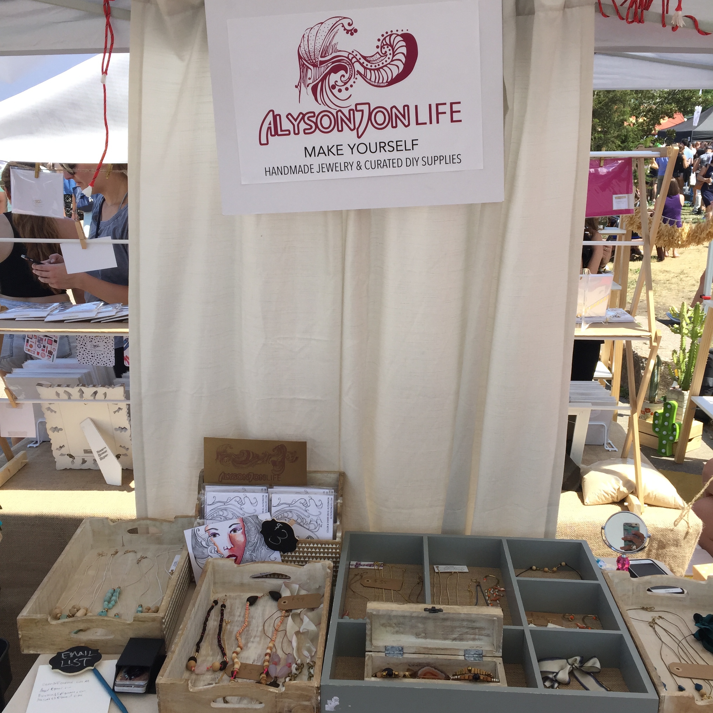 For the second fair date in the RCF Pop-up later that I month, I showed that I learned my lesson about the wind. The wind wasn’t as intense this time. I was ready for it though. I had new displays and a new booth mate. Instead of standing my displays up, I laid them down so they would not be affected by the wind. My new displays included hand carved wooden trays that looked more Anthropologie than shabby chic. I realized that my jewelry should be merchandised by color groups like I was so used to doing in my fashion work. I also added a sign with my logo. Sadly I was not able to replace the mirror.