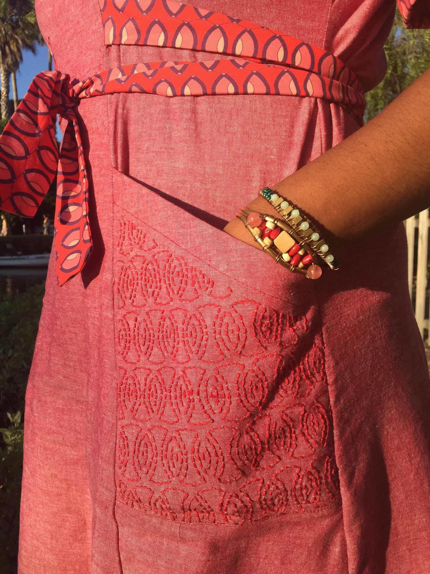 Embroidery and printed fabric applied to this simple Tea House dress by Sew House Seven makes this style really special. Those are the kinds of details that can really make a garment into the kind of clothing that you want to keep. Plus its easy to wear. Sewn, embroidered and original print by Alyson (me).
