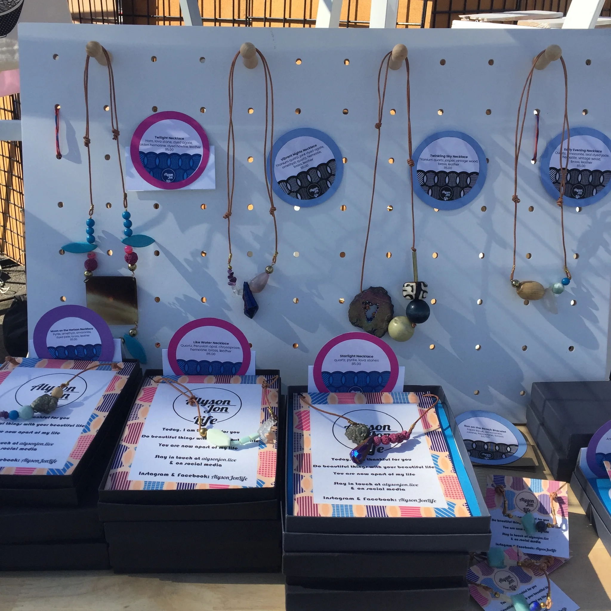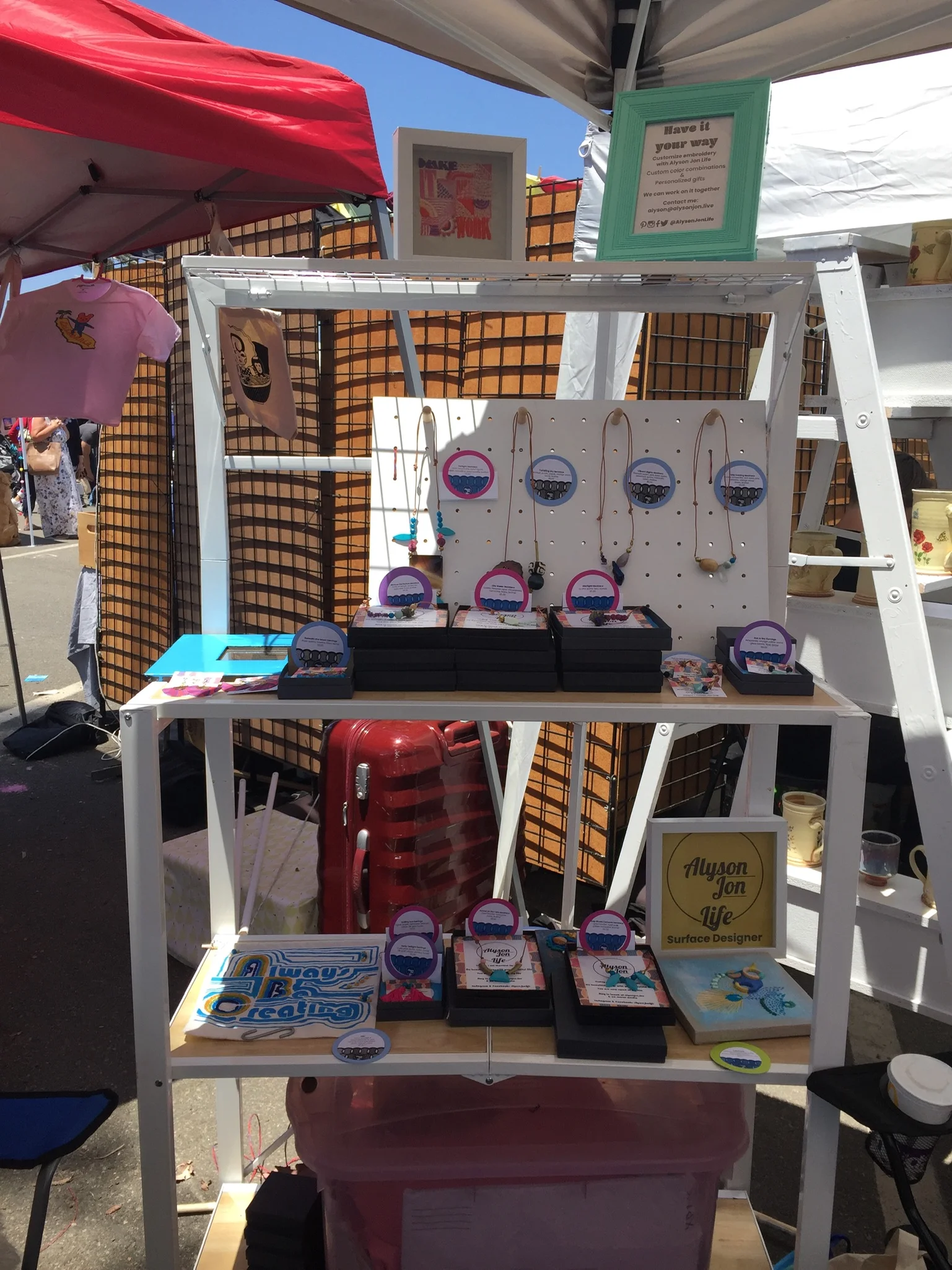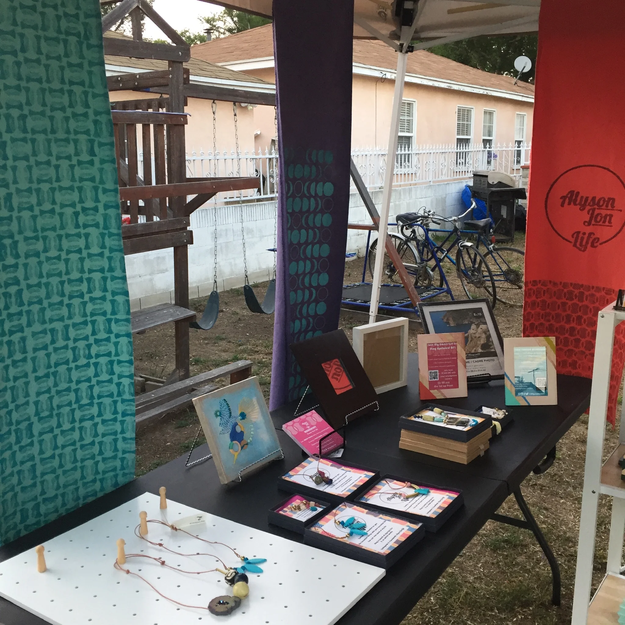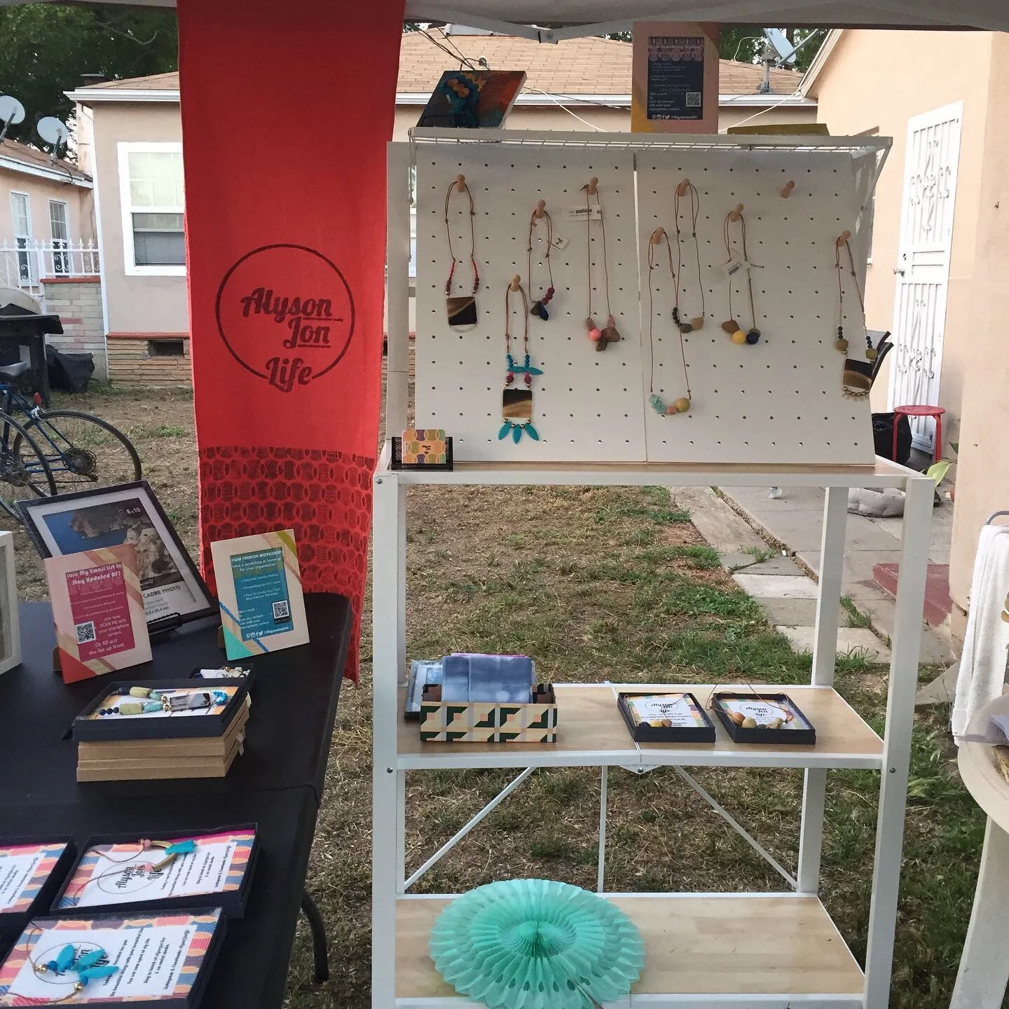 I found a folding shelf that is heavy but looks great. I used it to display my work which was mostly displayed in boxes. Small pegboards were a perfect hack for my long, adjustable necklaces which look great on people but are too cumbersome for most jewelry displays.