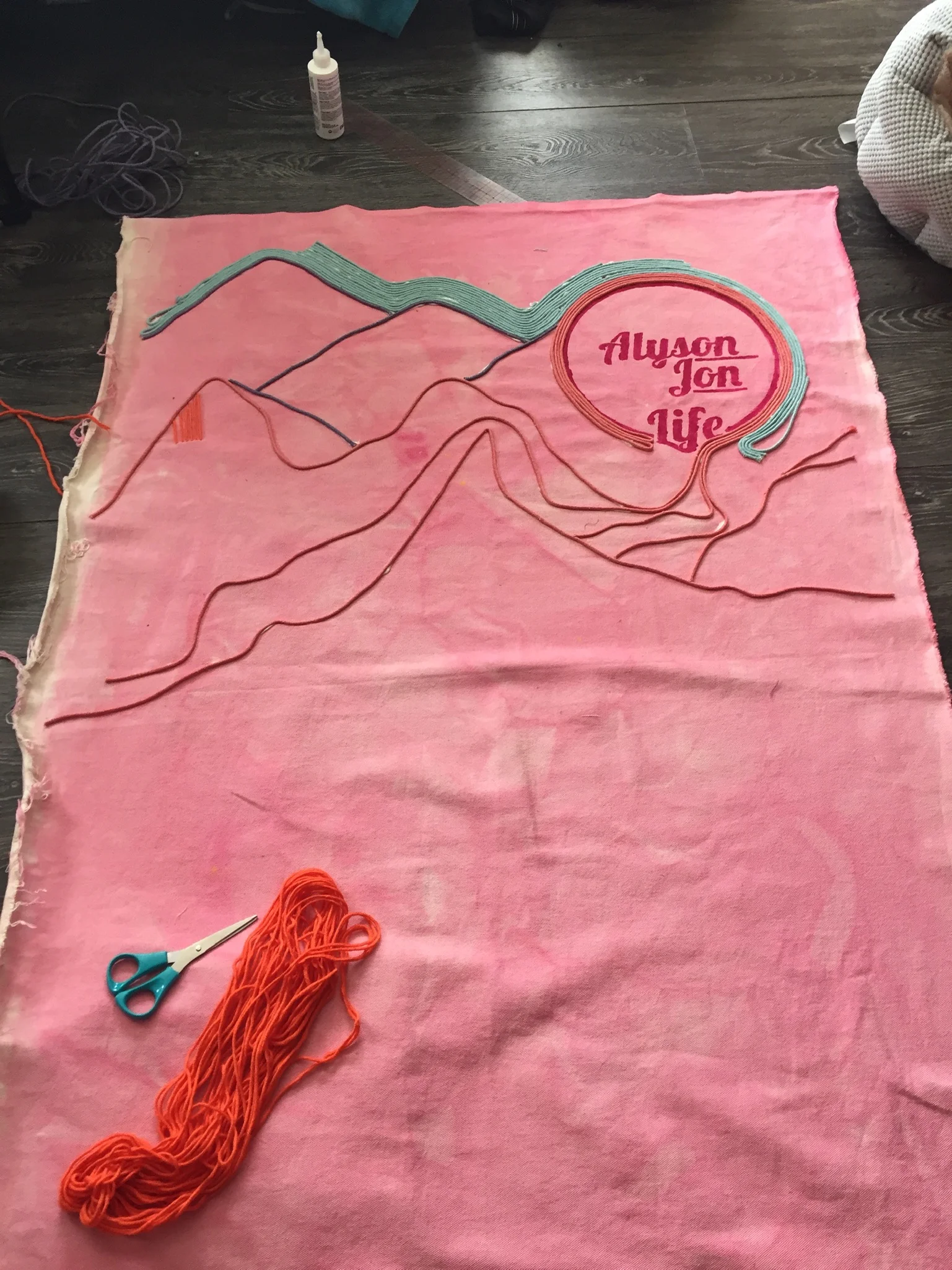 I started laying down the cording. I didn’t do an underdrawing or even a sketch. I just worked organically placing and gluing the cording down. Gem Tac was strong enough to hold everything down and it dried clear. I’m a big fan of Jackson Pollack’s process, so I would like to believe that I was channeling his work a bit as I leaning over my canvas splayed out on the floor of my house. I wrapped the logo with cording to symbolize radiating lines.