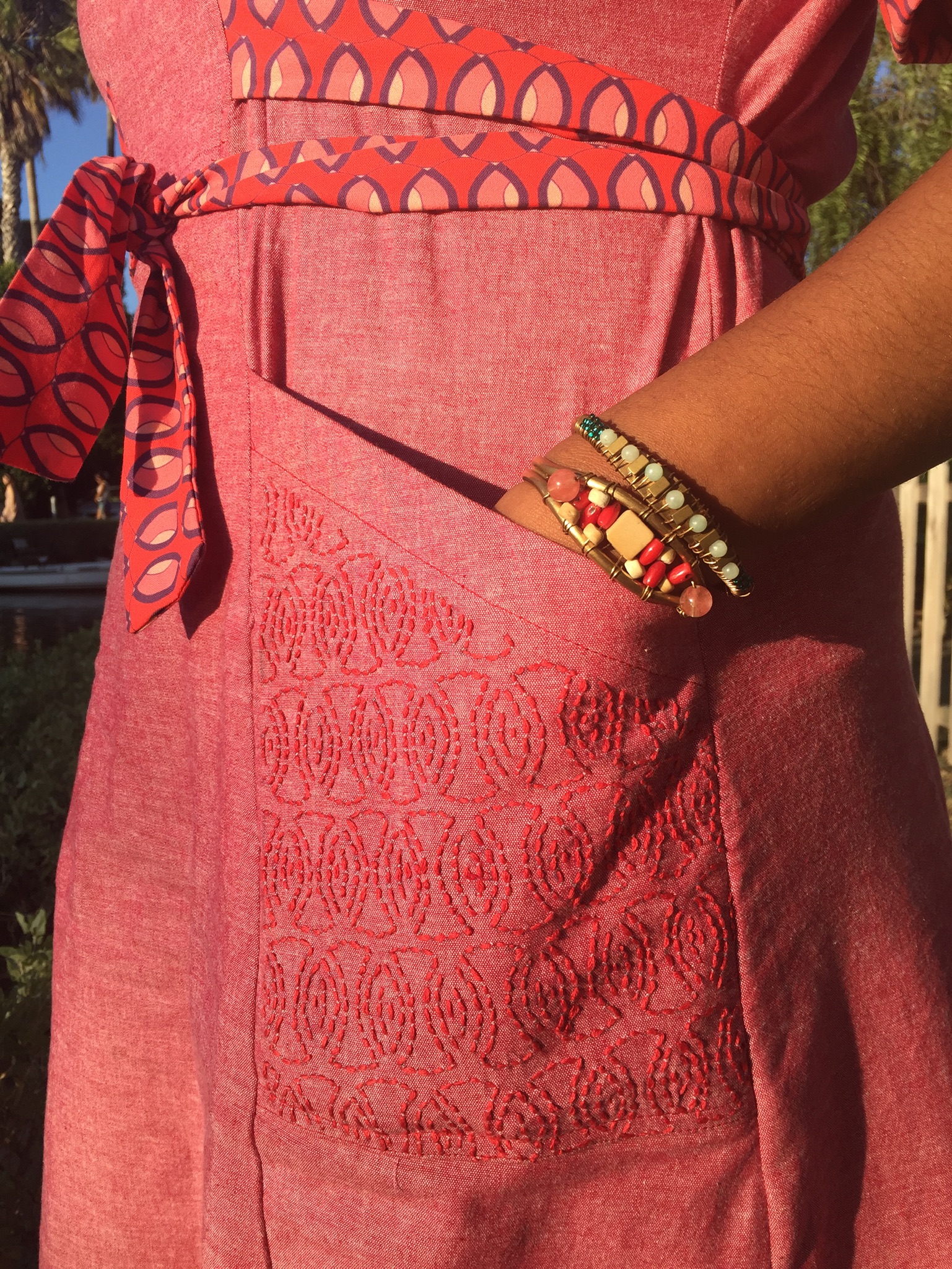 My hand embroidered pockets were inspired by Japanese sashiko stitching. The Eye See You waist tie shares a similar pattern.
