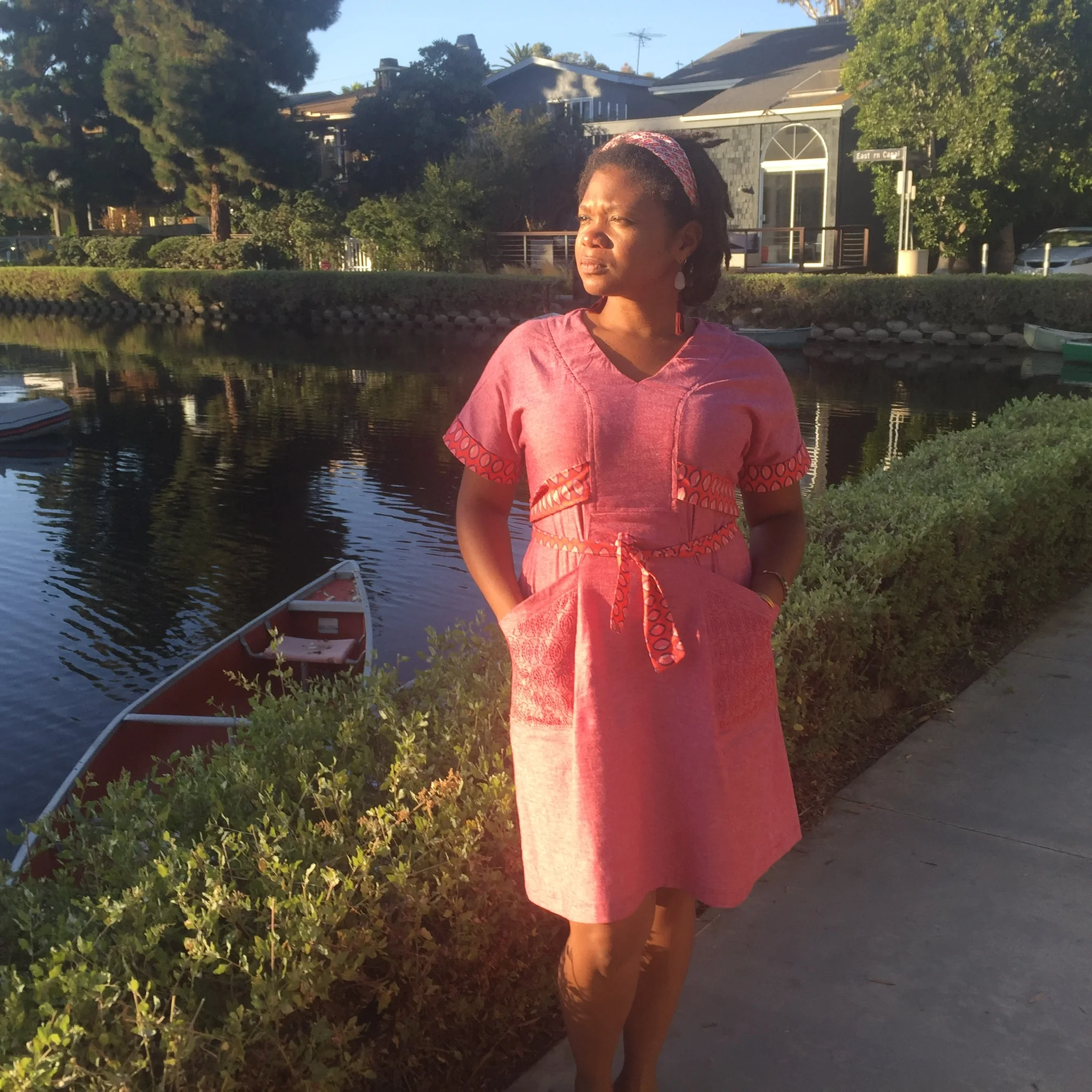 This is the Sew House Seven Tea House Dress done my way. Using cherry red chambray that I bought over a year ago, I decided to make this gorgeous pattern my own. You may recognize the fabric from another project. That project made me realize that the chambray was a great match for my fabrics in the Sunrise colors combination. I felt that the waist tie and sleeve cuffs were the perfect places to use my Eye See You design in Sunrise colorway. This was printed by Spoonflower on their Petal Signature Cotton fabric.