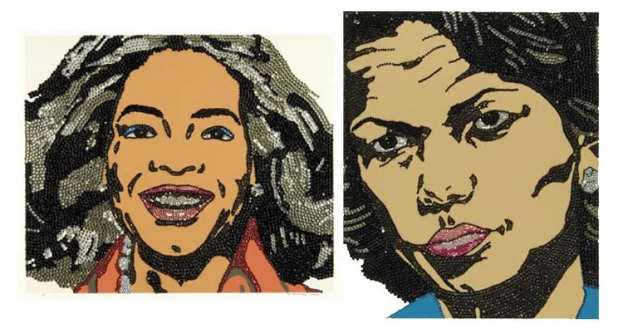 I love this artist's work. I always visit her pieces in Brooklyn Museum. Her female subjects are painted with enamel and rhinestones (!) in scenes inspired by 70s blaxploitation films. She brought glitter into the hallowed halls of fine art museums. If you know the white patriarchal upper class world of fine art, then you know rhinestones are considered to be antithesis to good art. But who could hate on these paintings? The garishness of the 1970s give her the license to use unconventional materials. This was the decade in which velvet paintings were considered a 'must have' in American home decor. Forever the print designer, I am also a fan of her use of retro textile prints. She reminds me of Gustav Klimt in the way that her figures are surrounded by these flattened patterned objects or clothing. Thomas also creates sculpture, installations and multimedia work.